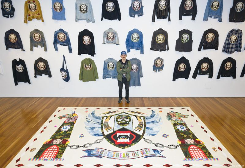 Venom takes the cool crazy train and goes beyond tradition, using recycled band t-shirts, denim jeans, leather jackets, and other materials to craft his useful quilts that can also serve as art pieces. He chooses and makes designs that are usually found in vintage tattoos, the occult, and motorcycle gangs, among many other subjects.