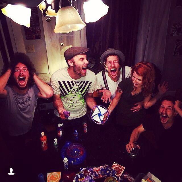 Ellice: From left to right- Andrew is the first you’ll see losing his mind (and maybe his afro) while witnessing Matt, to his immediate left in the paper boy hat, showing off his spin art skills. Andrew played guitar and mandolin on the recordings and recently has started to play bass on a few songs live. Matt plays bass now, primarily, and some lap steel guitar. In the center is Roddy who is so proud it looks painful; he is the lead singer and also plays acoustic and electric guitar. Next is me, Ellice; I play autoharp, synth, and glockenspiel. Lastly, to the far right is our drummer, Wes, who is either very enthused with spin art or the bottle of whiskey in his right hand.
